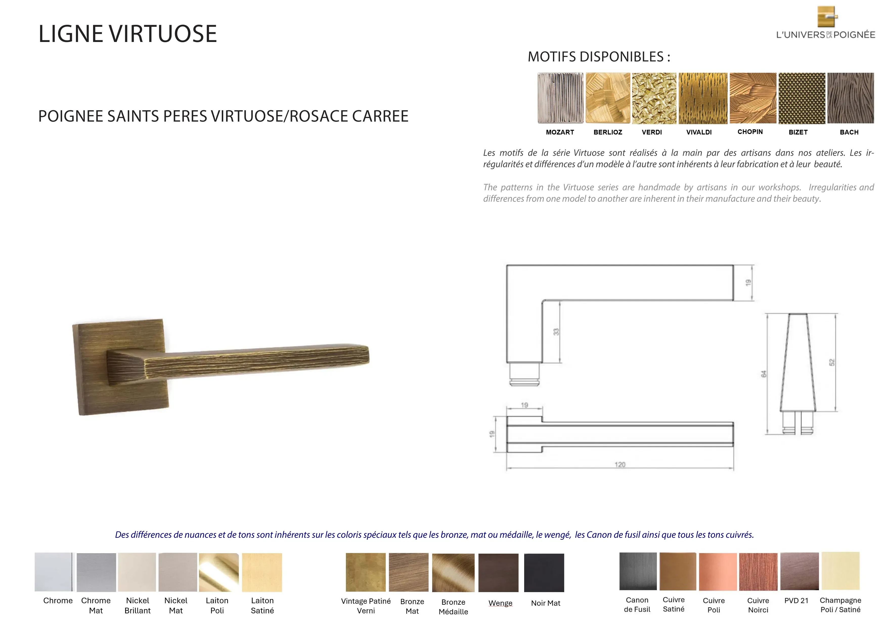 Parce que chaque intérieur mérite une finition sur mesure, la poignée de porte Saints Pères est disponible en plus de 15 coloris différents, parmi lesquels : Laiton satiné ; Laiton poli ; Chrome mat ; Chrome brillant ; Nickel mat ; Nickel brillant ; Bronze mat ; Bronze médaille ; Bronze vintage ; Wengé ; Blanc ; Noir mat ; Canon de fusil ; Cuivre satiné ; Cuivre brillant ; Cuivre noirci ; Champagne mat ; Champagne brillant